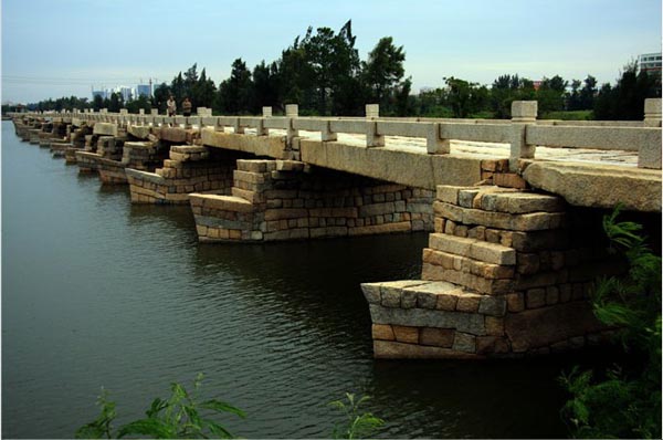 安平橋:屬于中國古代連梁式石板平橋,始建于南宋紹興八年(1138),歷時十四年告成。明清兩代曾多次重修。該橋是中古時代世界最長的梁式石橋,也是我國現(xiàn)存最長的海港大石橋。位于福建省晉江縣的安海鎮(zhèn),建于宋代,當?shù)厝怂追Q“五里橋”。橋面由7條大石板鋪成,橋頭有五層六角磚砌成的寶塔一座,此橋為古代跨度最大的梁式石橋,有“天下無此長橋”的美稱。
