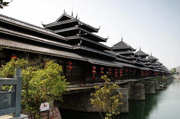 風雨橋:坐落在廣西三江縣的程陽村邊的林溪河上,全橋為石墩木面瓦頂結(jié)合而成。橋上建有五座寶塔形狀的樓亭,可避風雨。整座橋無一鐵釘,全用桁槽銜接,它斜穿直套、縱橫交錯,十分精致牢固。坐落在廣西三江林溪河上的程陽橋是風雨橋的代表。因橋上建有廊和亭,既可行人,又可避風雨,故稱風雨橋。這座橋建于1916年,是一座四孔五墩伸臂木梁橋。其結(jié)構(gòu)以橋墩、橋身為主的兩部分。墩底用生松木鋪墊,用油灰沾合料石砌成菱形墩座,上鋪放數(shù)層并排巨杉圓木,再鋪木板作橋面,橋面上蓋起瓦頂長廊橋身。橋身為四柱抬樓式建筑,橋頂建造數(shù)個高出橋身的瓦頂數(shù)層飛檐翅起角樓亭、美麗、壯觀。五個石墩上各筑有寶塔形和宮殿形的橋亭,逶迤交錯,氣勢雄渾。長廊和樓亭的瓦檐頭均有雕刻繪畫,人物、山水、花、獸類色澤鮮艷,栩栩如生,是侗鄉(xiāng)人民智慧的結(jié)晶