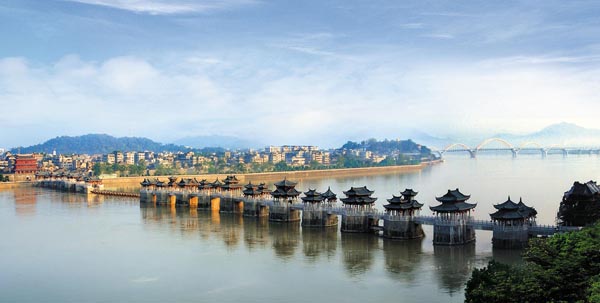 廣濟橋,俗稱湘子橋,宋乾道七年(1171年)太守曾江創(chuàng)建,初為浮橋,由八十六只巨船連結(jié)而成始名“康濟橋”。 淳熙元年間(1174年)浮橋被洪水沖垮,太守常煒重修之,并創(chuàng)杰閣于西岸,開始了西岸橋墩的建筑,至紹定元年(1194年)歷五十四年間,朱江、王正功、丁允元、孫叔謹?shù)忍叵嗬^增筑,完成了十個橋墩的建造。其中又以淳熙十六年(1189年)太守丁允元建造的規(guī)模最大、功績最著而改稱西橋為“丁公橋”。該橋是現(xiàn)存較早的開關(guān)活動式大石橋。