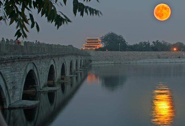 盧溝橋:始建于金大定二十九年(1189年),明正統(tǒng)九年(1444年)重修。清康熙1697年時毀于洪水,康熙三十七年(1698年)重建,坐落在北京廣安門西南約10公里之處,該橋因跨越在盧溝河上(今永定河)因而得名盧溝橋,是北京市現(xiàn)存最古老的石造聯(lián)拱橋。盧溝橋全長266.5米,寬7.5米,最寬處可達9.3米。有橋墩十座,共11個橋孔,整個橋身都是石體結(jié)構(gòu),關(guān)鍵部位均有銀錠鐵榫連接,為華北最長的古代石橋。全橋均用白石建成,兩邊石欄雕柱各140根,石柱頭上雕有蹲伏形態(tài)各異石獅子485只。